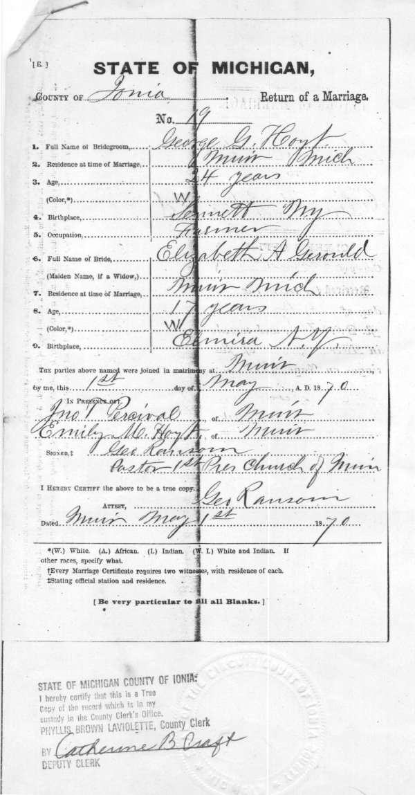 & JONATHAN G HOYT CAME TO MUIR - LYONS, IONIA CO., MI;