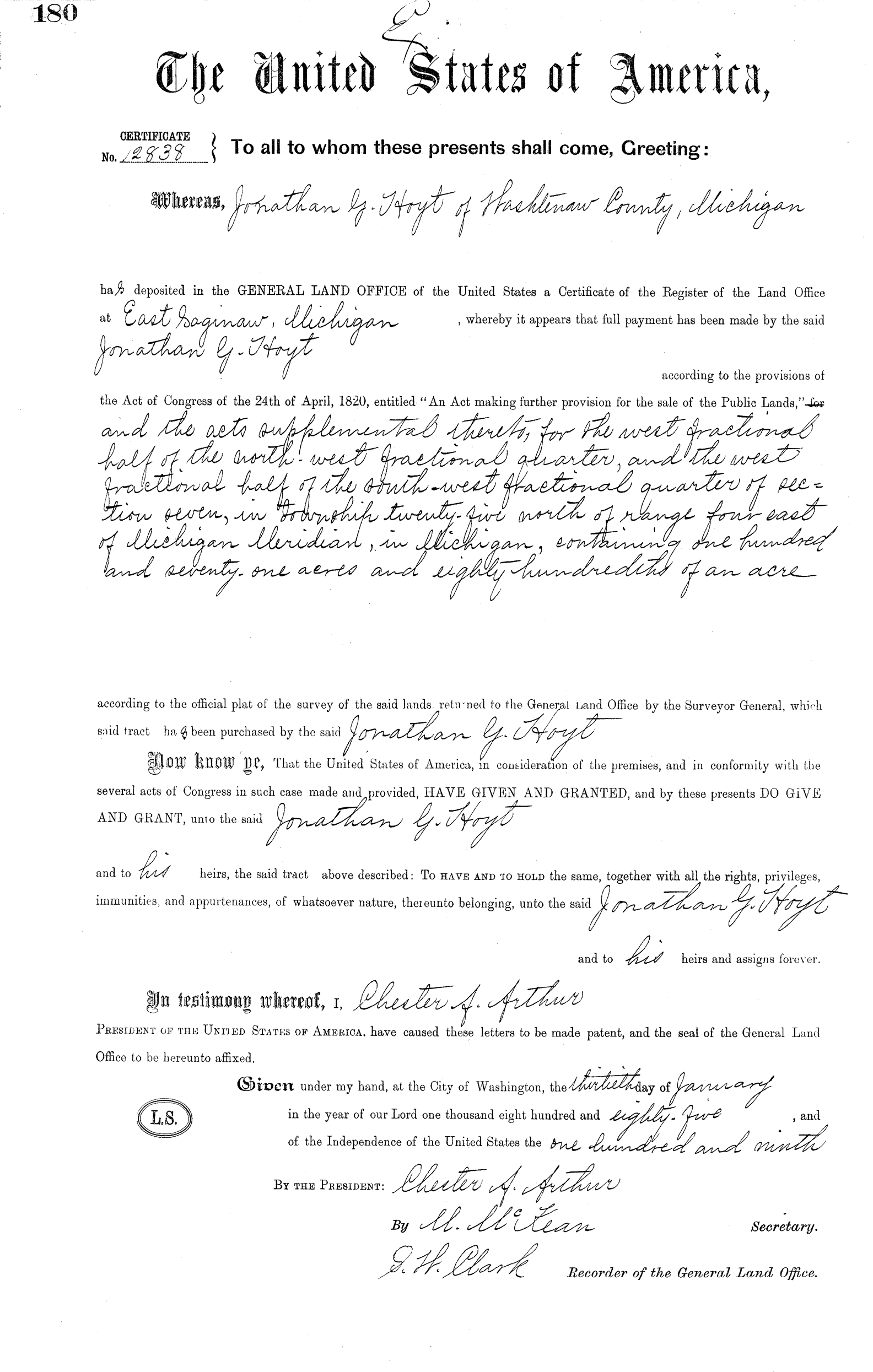 followed to Spaokane, WA, 1900's. ***NEW*** JONATHAN G. HOYT - LAND PATENT - 171 A. SALINE, MI (GIF) - (.PDF)
