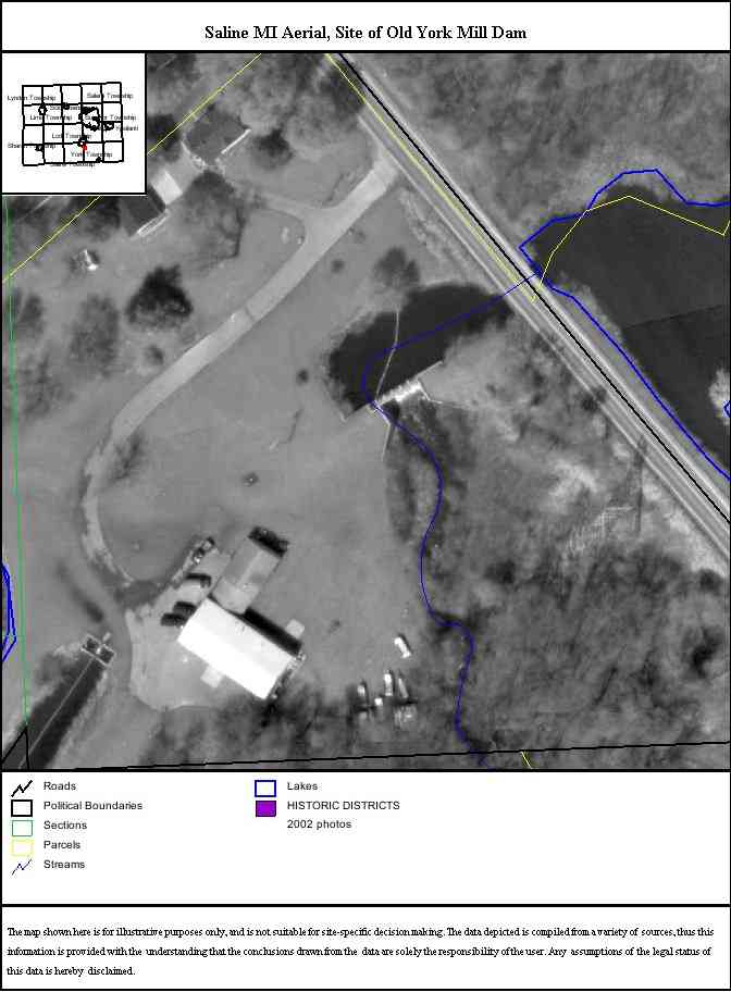In Saline, MI, turn S. at top of Hill in Downtown at Light, on Saline-Macon Road, go down hill about 3/4 mile. On right.. (View Recent Photos (2010) of the York Mill Site, of Saline, MI, It is now, a Fisheries Research Station, DNR of MI)